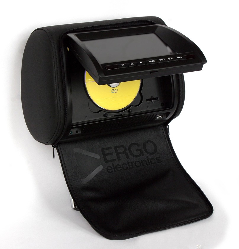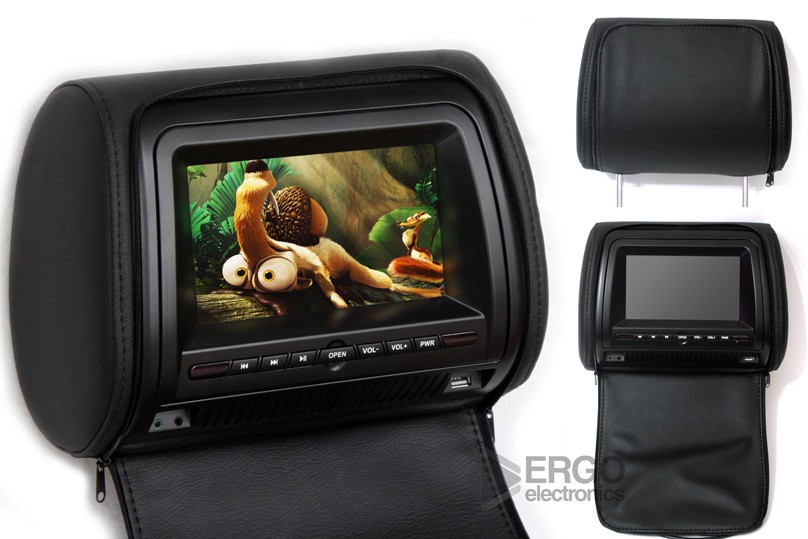 КОМПЛЕКТ ПОДГОЛОВНИКОВ СО ВСТРОЕННЫМ DVD ПЛЕЕРОМ И LCD МОНИТОРОМ 7" ERGO ER700H цвет ЧЁРНЫЙ. LCD монитор 7”, цифровая матрица 800x480. Разъёмы USB и SD для подключения карт памяти. Высококачественная искусственная кожа.