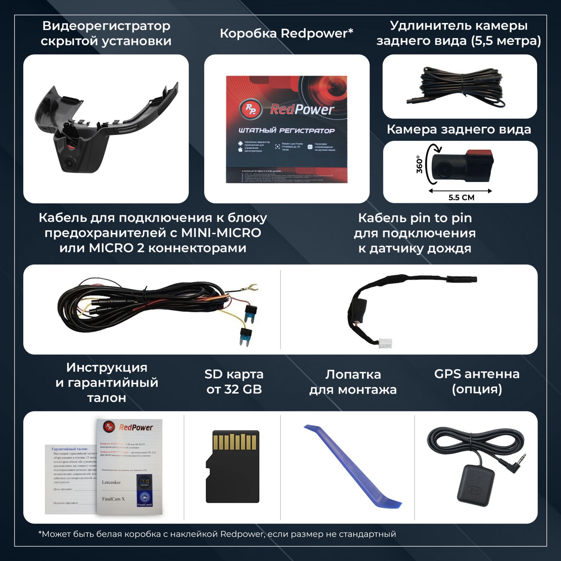 Wi-Fi видеорегистратор Redpower предназначен для скрытной установки в любой автомобиль. Видеорегистратор не имеет своего экрана, но легко соединяется со современными смартфонами на платформах Android и IOS (несколько вариантов приложений). C экрана смартфона Вы можете управлять настройками видеорегистратора, скачивать и просматривать видео на SD карте.