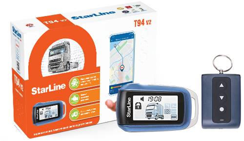 StarLine T94 v2 -- Надежный охранно-телематический комплекс для защиты грузового транспорта с интеллектуальным автозапуском, несканируемым диалоговым кодом управления, опциональными GSM, GPS-ГЛОНАСС интерфейсами, ударопрочным брелком управления, 128-канальным помехозащищенным трансивером с дальностью оповещения до 2000 м.